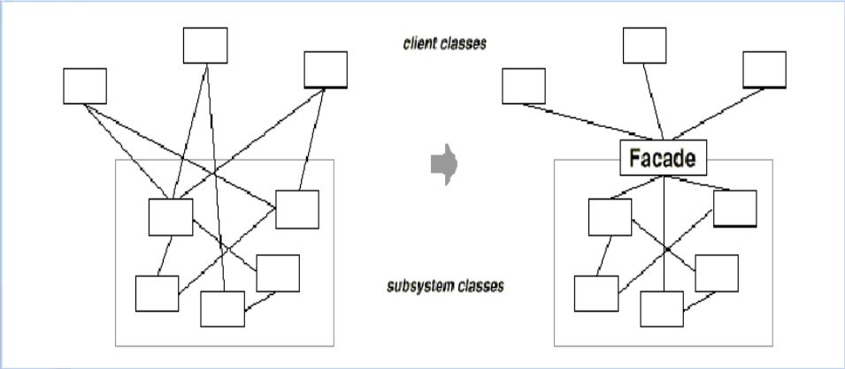 - Provides a unified interface to a set of interfaces in a subsystem, this unified interface is called as a facade object