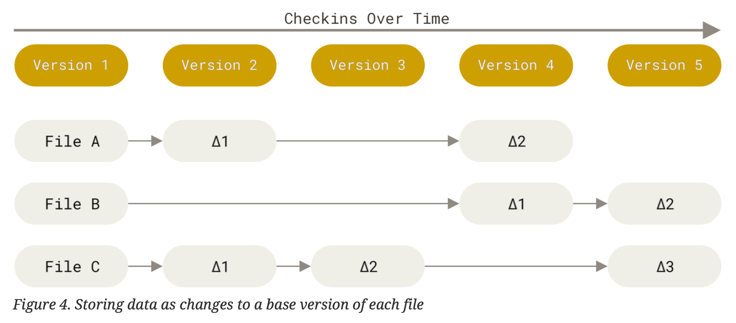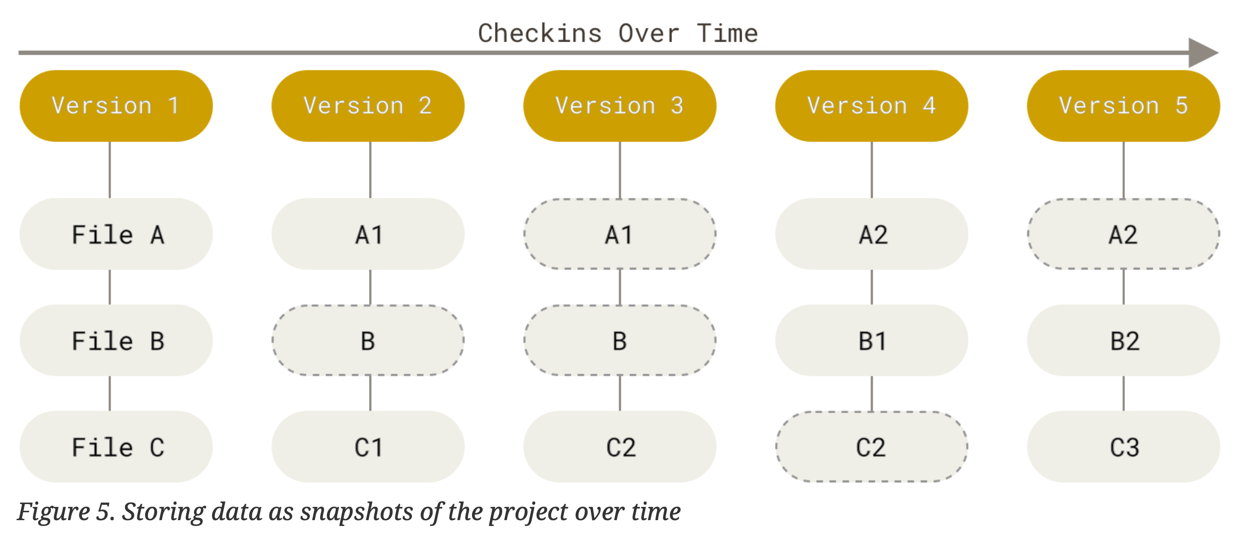 - Unlike a lot of other VCSs, git stores snapshots not differences (called delta-based version control)