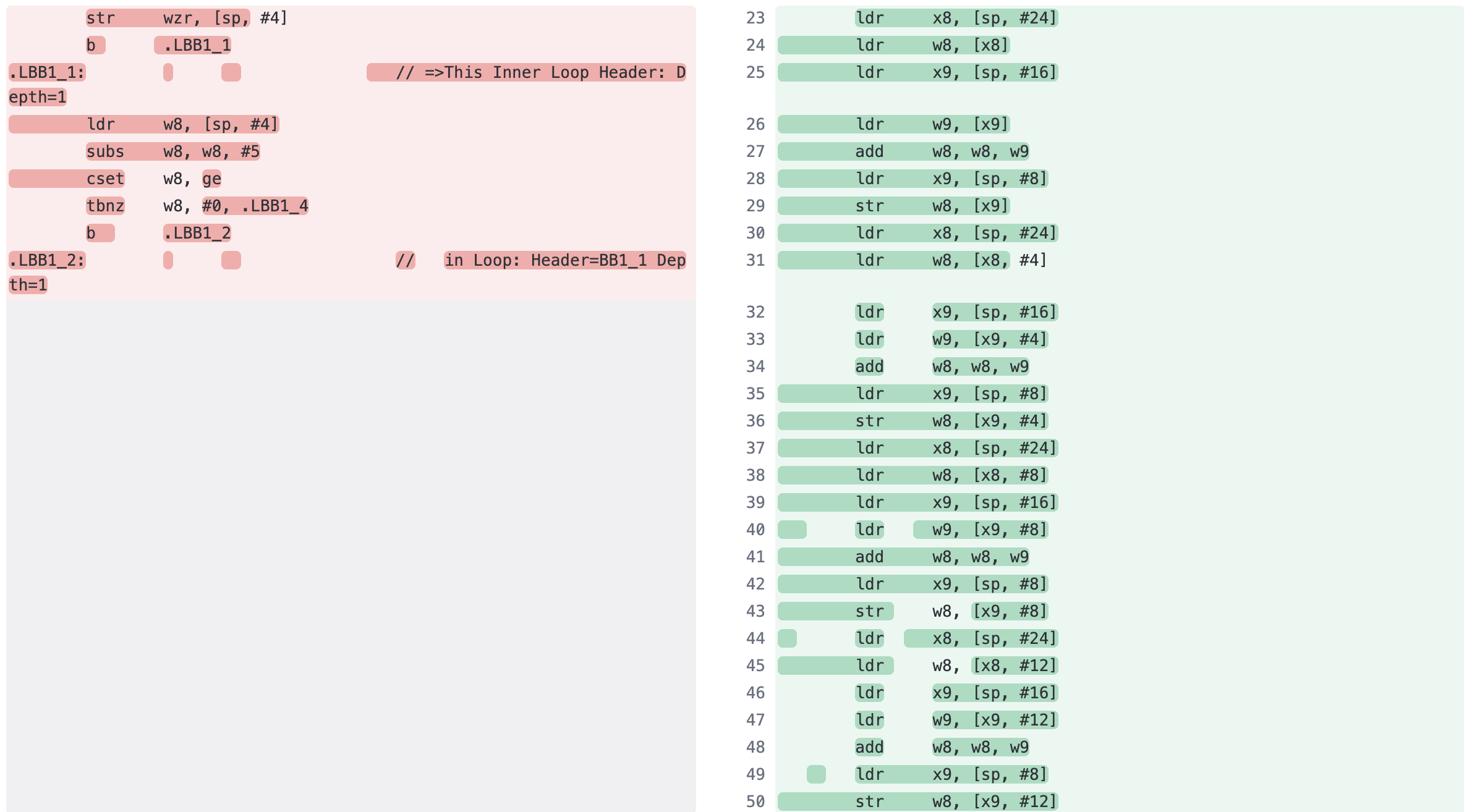 }Corresponding Assembly code (armv8-a clang 15.0.0)